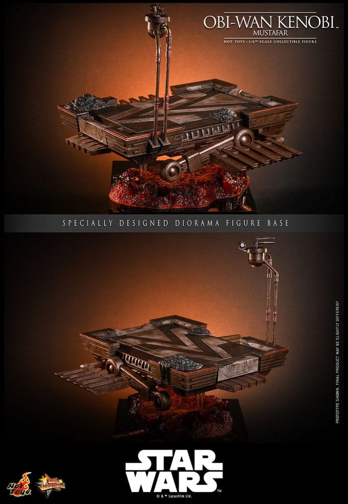 La figura de acción de Star Wars viste un traje finamente confeccionado con efectos de desgaste para capturar la intensidad del feroz duelo en Mustafar. Su conjunto incluye un tabardo, una túnica exterior y una túnica interior, todo ello atado a la cintura con un obi y un cinturón utilitario detallado, completado con pantalones y botas largas. Se incluyen nueve manos intercambiables y espadas láser azules con opciones de empuñadura con y sin iluminación LED para una acción dinámica. La figura se exhibe en una base diorama especialmente diseñada con una plataforma repulsora y efectos de lava que reproducen el paisaje volcánico de Mustafar, lo que permite a los coleccionistas recrear la icónica escena del duelo entre Obi-Wan Kenobi y Anakin Skywalker.